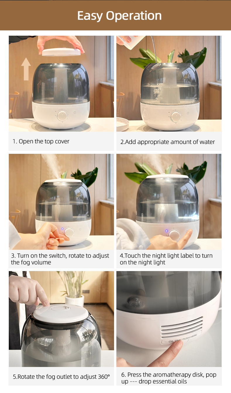 Onze nieuwe ultrasone aromatherapie-luchtbevochtiger met grote capaciteit van 5 liter, elektrisch thuishotelgebruik, maakt uw gebruik veiliger en intiemer. Het is zachter dan conventionele luchtbevochtigers en verstoort je studie, werk en rust niet. Watertank vullen, handig en snel, transparante watertank, waterniveau zichtbaar. Nanofijne mist 300 ml/u, maximale mist kan 8 uur duren, minimale mist kan 50 uur duren, kan aromatherapie toevoegen om je humeur te kalmeren. Het lichaam van de luchtbevochtiger is uitgerust met een onafhankelijk nachtlampje, zodat uw nacht vol veiligheid is.